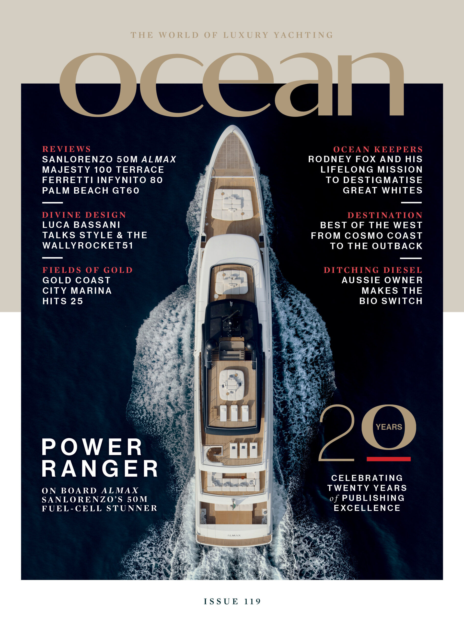 Making waves on the cover of Ocean Magazine is ALMAX — the first Sanlorenzo 50Steel and the world’s most advanced 50-metre yacht powered by methanol fuel cells.