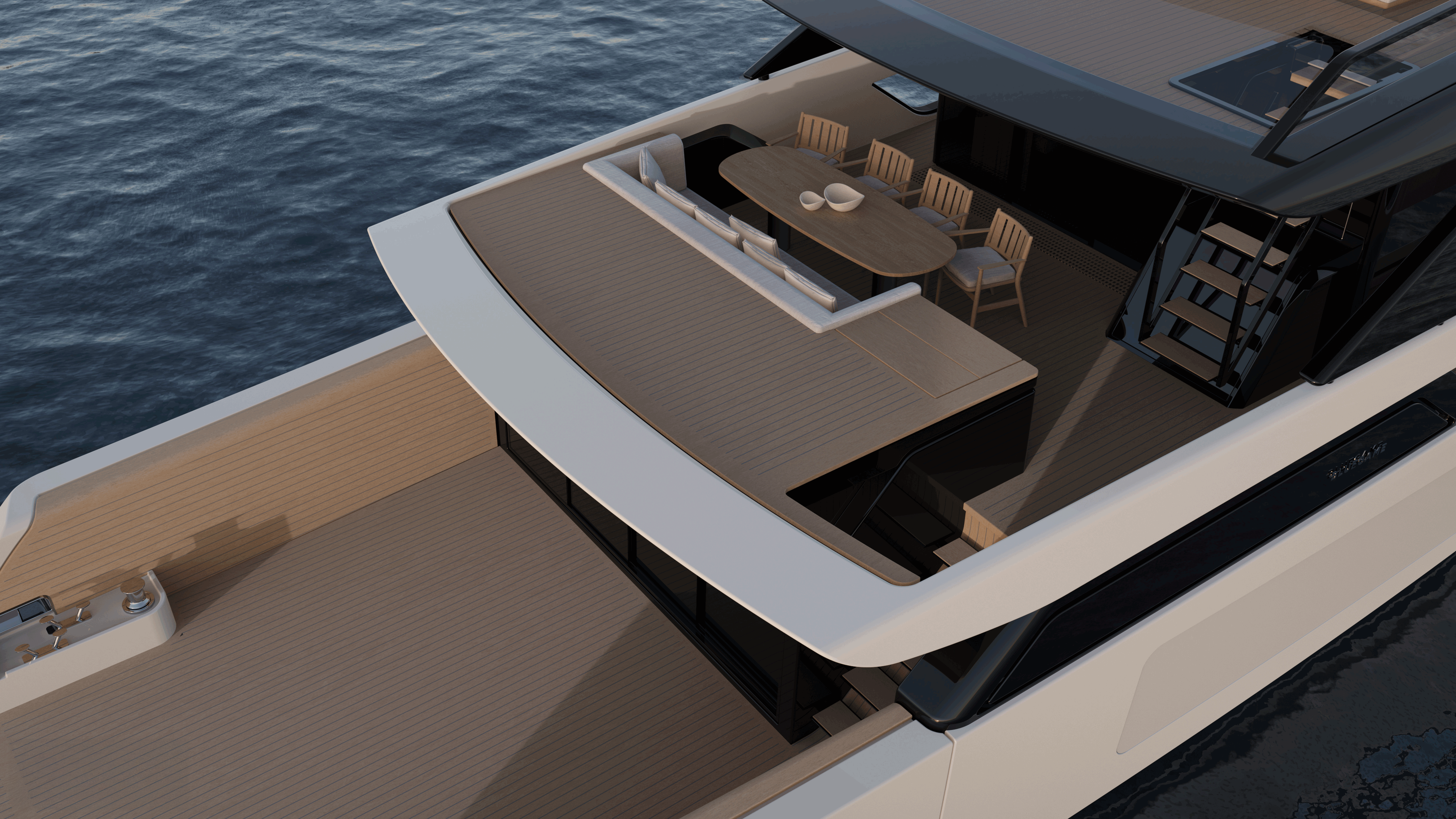 The architecture of BGX83 gains significant space and volume compared to its predecessors, particularly in the stern. The signature beach area evolves into abigger open-air lounge: in addition to the hydraulic up-and-down platform, the yacht now features astarboard side opening, expanding the width and completing the area’s connection to the sea. This connection extends inward.