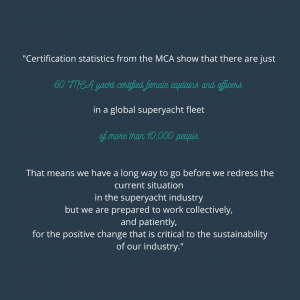 Certification statistics from the MCA show that there are just 60 MCA yacht certified female captains and officers in a global superyacht fleet of more than 10,000 people. That means we have a long way to go before we redress the current situation in the superyacht industry but we are prepared to work collectively, and patiently, for the positive change that is critical to the sustainability of our industry.