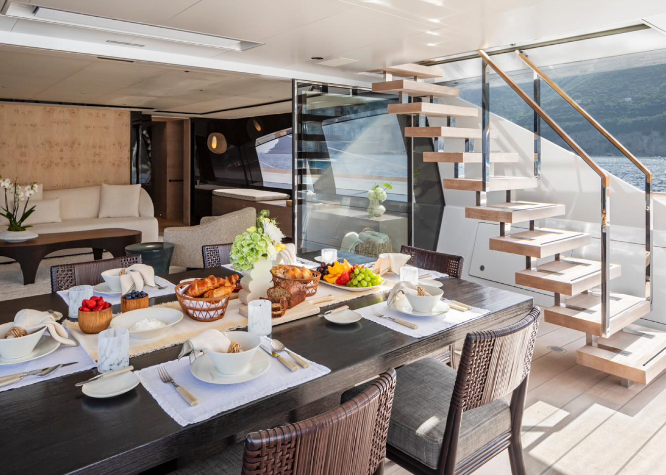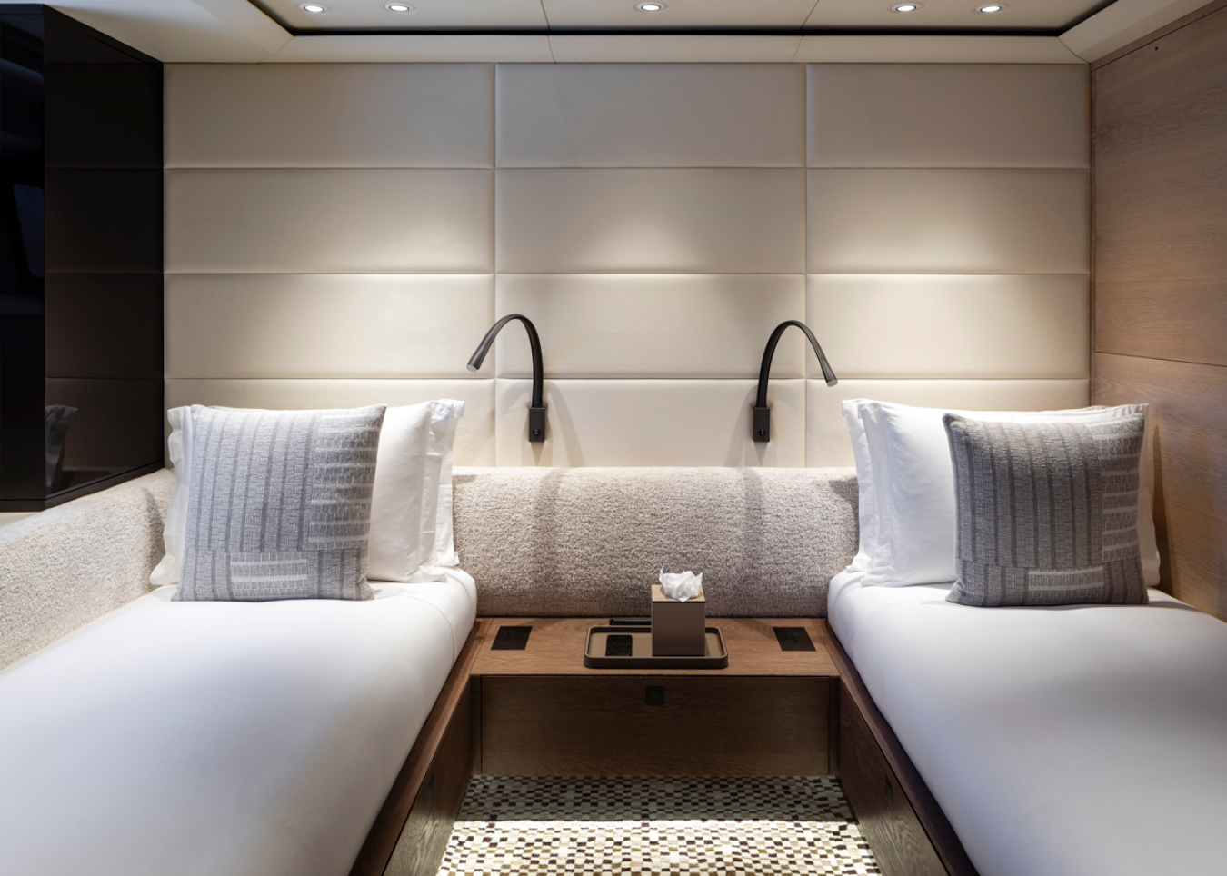 As TWIZZLE settles into a picturesque harbour, gather on the customised stern platform to choose from this charter yacht’s well-endowed toy box. From stand-up paddleboards and kayaks to snorkelling and dive gear, TWIZZLE has plentiful options including Flite boards for the more adventures and eBikes for guests who wish to explore the shore as well. Or get towed behind one of the two 6.4m Castoldi jet tenders on the kneeboard, wakeboard or waterskis.